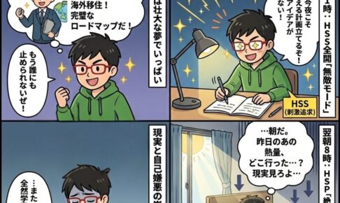 HSS型HSPの生存戦略 【転職20回、高校中退】HSS型HSPの俺が「都合のいい人」を卒業して、人生を静かに逆転させた物語 2025.12.22 管理者 「よし、今夜こそ人生を変える計画を立てるぞ!」 深夜1時、脳内は壮大な夢でいっぱい。でも、翌朝8時になると昨日の熱量はどこへやら。 「結局、俺は何がしたいんだ……」と自己嫌悪の嵐。 あなたは、そんな「アクセルとブレーキを…